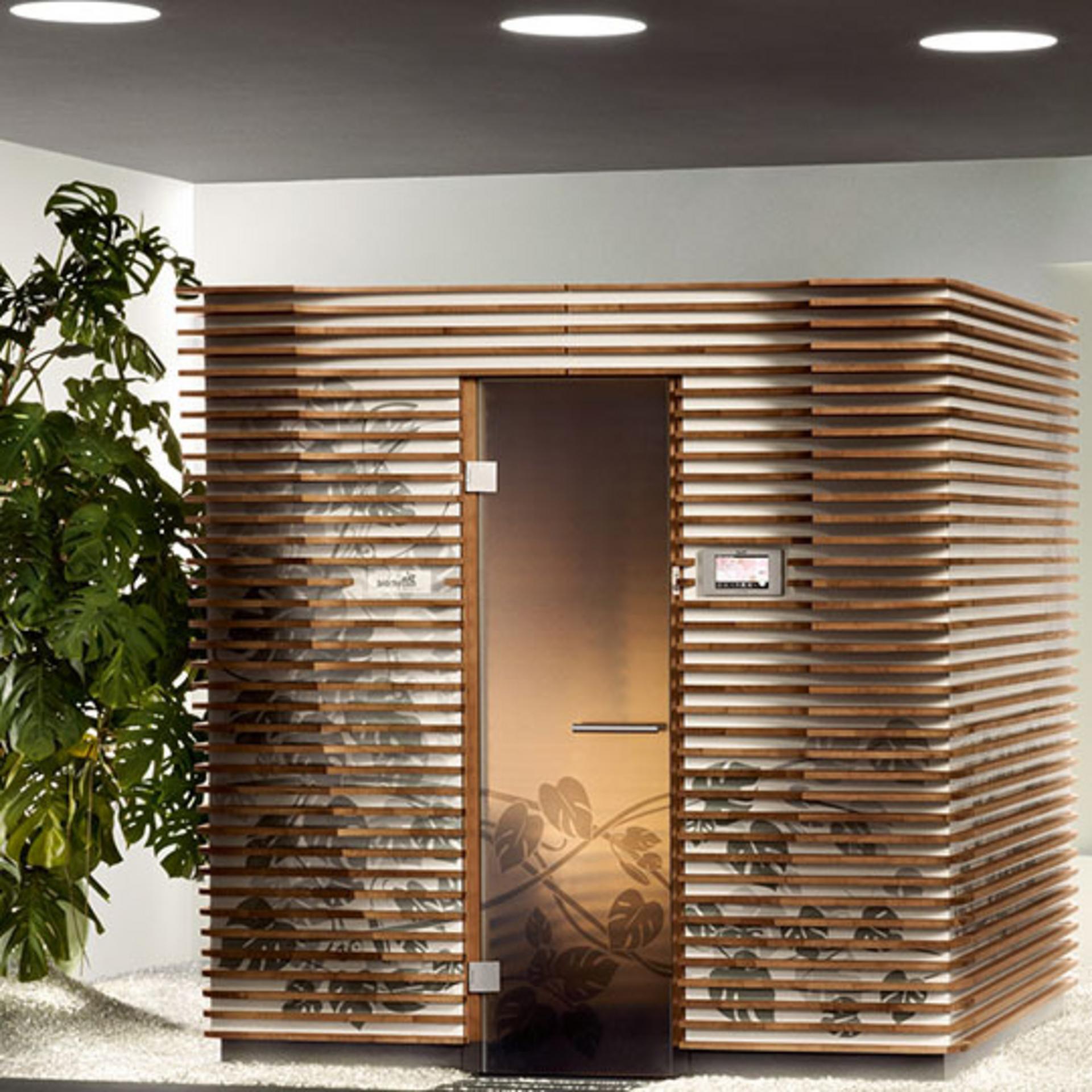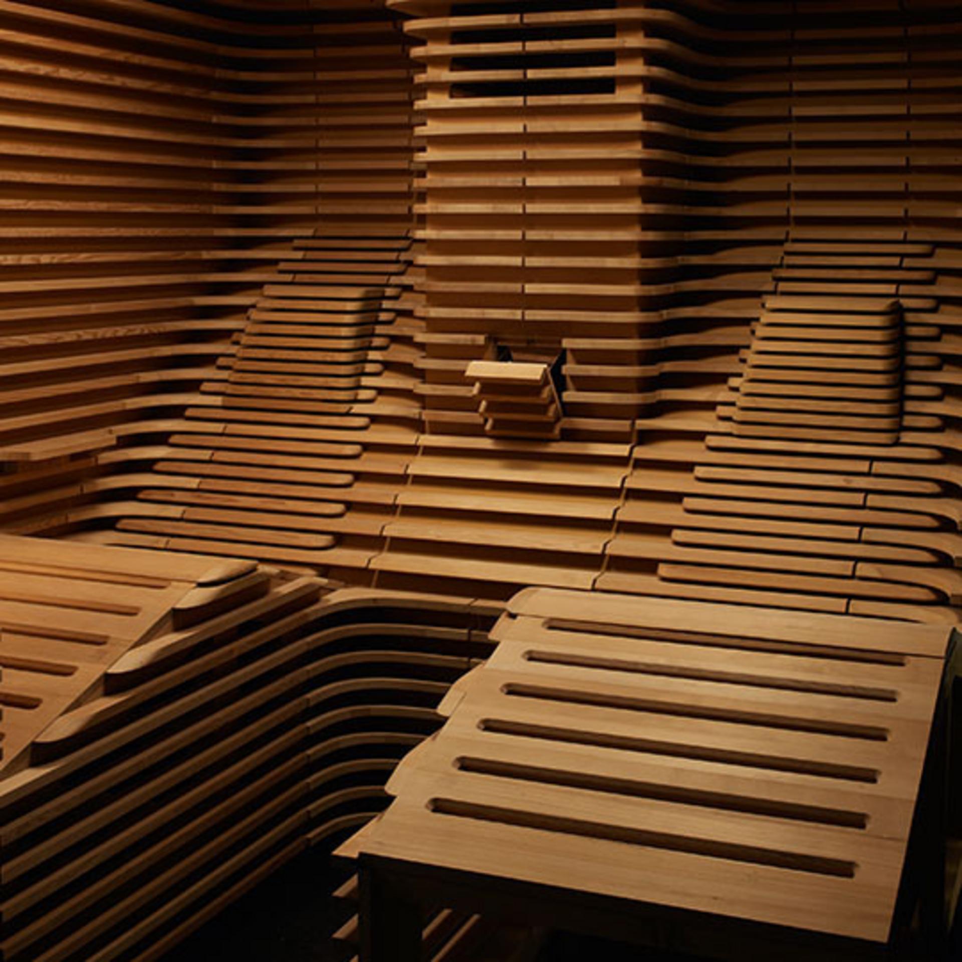 Den ganzheitlichen Genuss verstärken bei der Biorhythm Sauna Private Edition die zwei Körperformliegen, welche ebenfalls in Lamellenoptik wie aus einem Block gefräst zu sein scheinen. Ein neu konstruiertes Ofensystem und eine speziell entwickelte Aufgussklappe machen ausgiebige Aufgüsse auch in der Designsauna möglich. Das Biorhythm Lighting vervollständigt die architektonische Inszenierung.