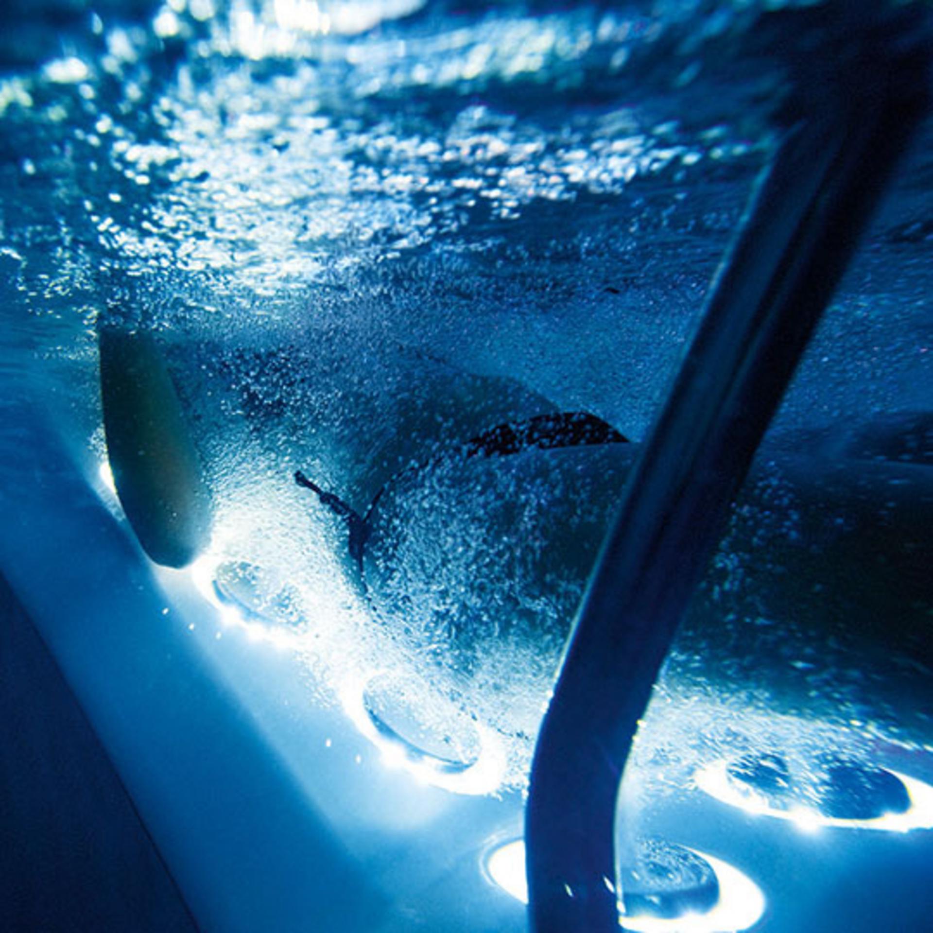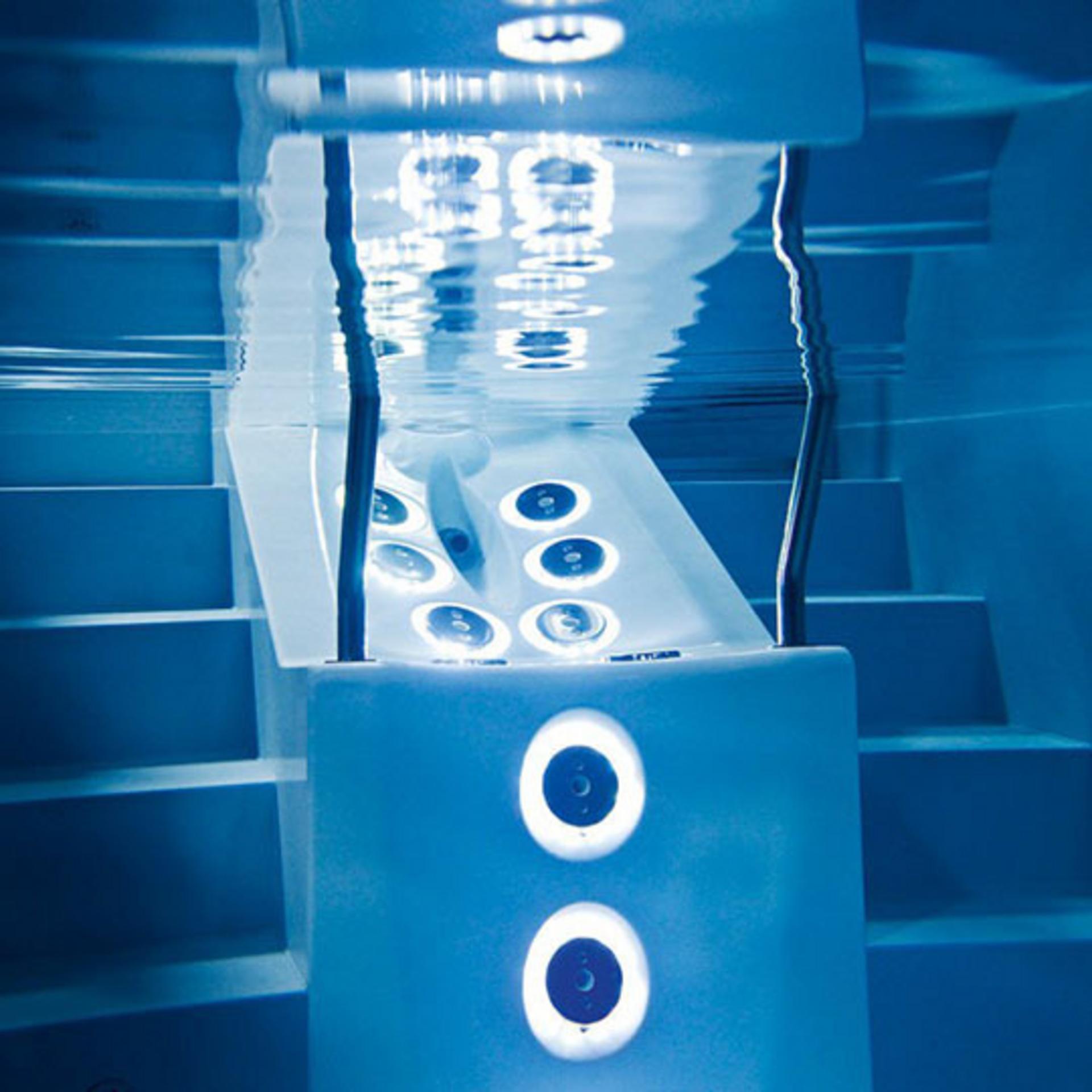 FloatingLounge vereint zahlreiche, individuell programmierbare Funktionen – von Ganzkörpermassagen über anspruchsvolle sportliche Übungen bis zu therapeutischen Anwendungen – in einem Design, das sich harmonisch in jede Bäder- und Spa-Architektur integrieren lässt. Massagedüsen im Rücken-, Waden- und Fußbereich bieten prickelnde Entspannung.