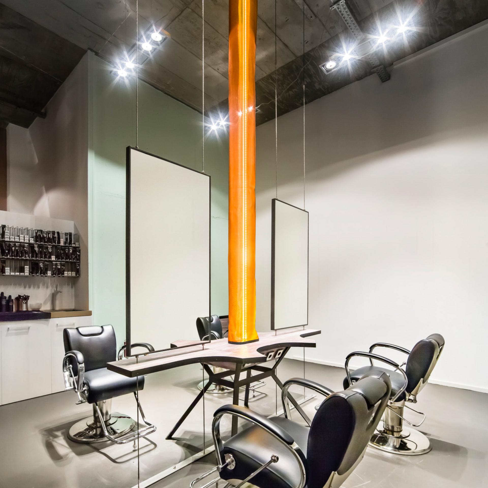 Die Gestaltung des Friseursalons von Micha Pelz erfolgte aus der idealen Fusion von Funktionalität und modernem Innendesign. Der Designer Nik Schweiger kreierte einen außergewöhnlichen Raum im Sinne seiner Designphilosophie, die durch moderne und virtuelle Einflüsse geprägt ist. Die Lichtskulptur gefertigt aus Kupfer bildet den Blickfang der Räumlichkeit und weckt das Interesse seiner Betrachter. Der Fotograf Michael Tewes hat in seinen Bildern eingefangen, wie das integrierte LED-Licht einzigartige Lichtreflexionen erzeugt, die den gesamten Raum in eine warme und beruhigende Atmosphäre taucht. Der ergonomisch geformte Friseurtisch wurde aus einer Altholzplatte und rohem Stahl gefertigt. Die in die Höhe ragenden, frei hängenden Spiegel, wie auch die filigranen Beine des Tisches, verleihen dem ganzen Ensemble Leichtigkeit und Offenheit: wichtige Faktoren für einen angenehmen Friseurbesuch.