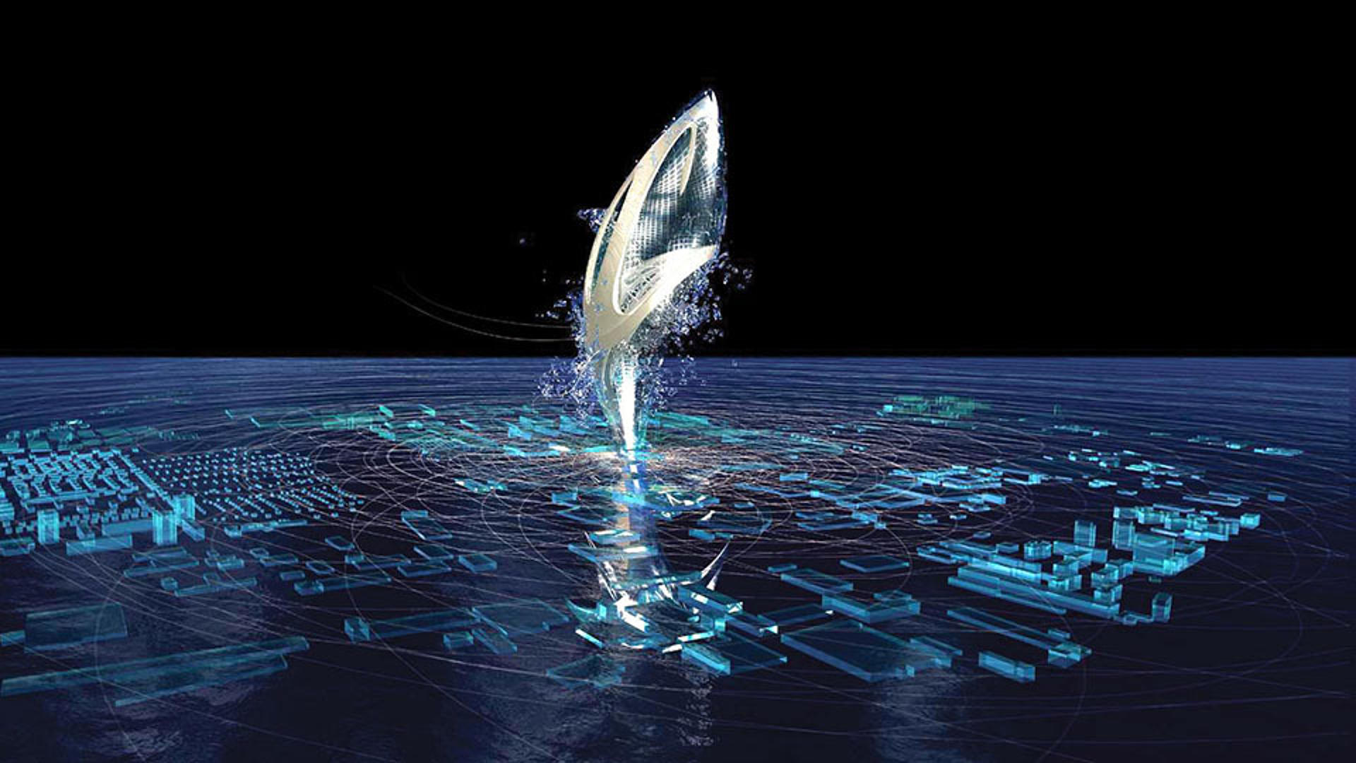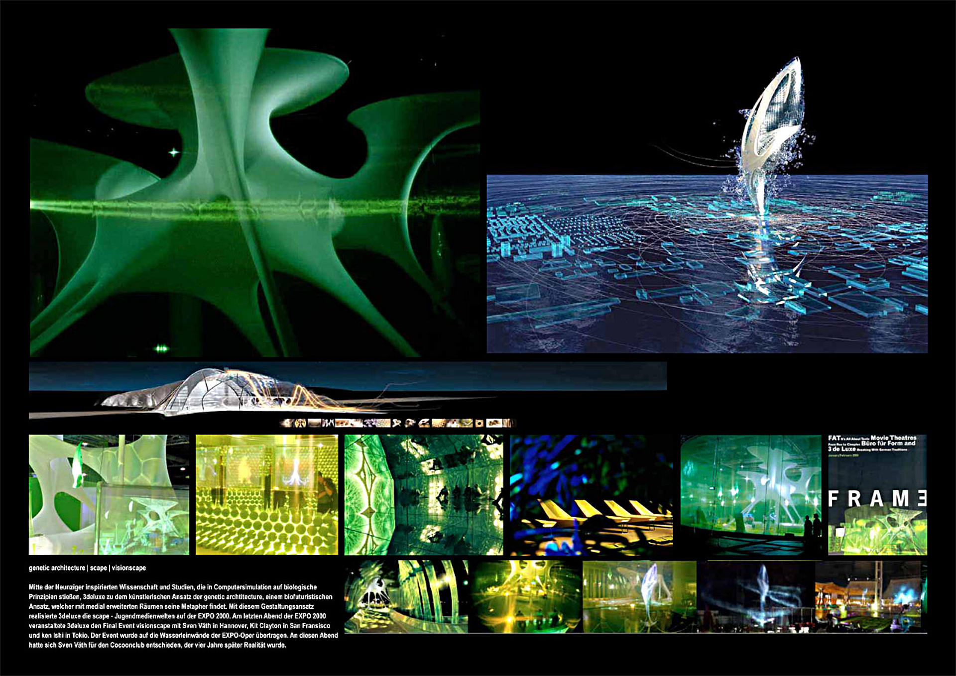 Die bürointerne Diskussion über ein mögliches Wahrzeichen für die Expo 2000 führte zur Gestaltung der virtuellen Architektur ‘visionscape’. Der um die Jahrtausendwende hochaktuelle Diskurs über computergenerierte Architektur legte nahe, die Expo durch ein ebensolches Symbol zu repräsentieren. Der Entwurf reizt die unbegrenzten Dimensionen der Virtualität ironisch aus: Die knospenähnliche Form von 'visionscape’ wächst bis zu einer Höhe von zwei Kilometern über das Expo-Gelände hinaus.Innerhalb einer 4000 qm großen Messehalle wurde die interaktive Erlebnislandschaft 'scape’ als physisch erfahrbarer Ausschnitt dieses immateriellen Konstrukts in die Realität umgesetzt.